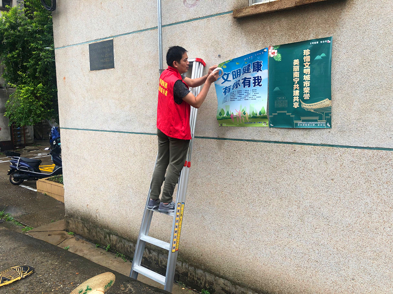 志愿者在張貼創(chuàng)城宣傳報(bào)(曾慧玲)